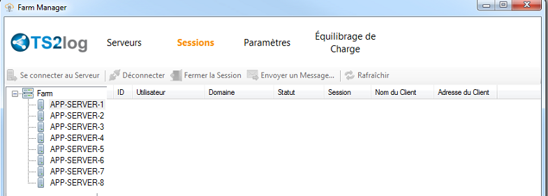 Dans cette fenêtre, vous pouvez voir la liste des sessions utilisateur sur n’importe quel serveur d’application de la Ferme, vous connecter au serveur d’application sélectionné et effectuer plusieurs actions sur une ou plusieurs session(s) utilisateur en la/les sélectionnant et en cliquant sur l’un des boutons suivants :